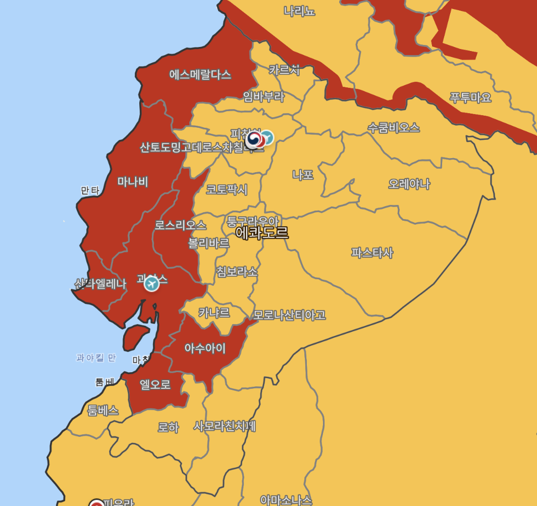 에콰도르 서부 해안가는 출국권고 지역입니다.