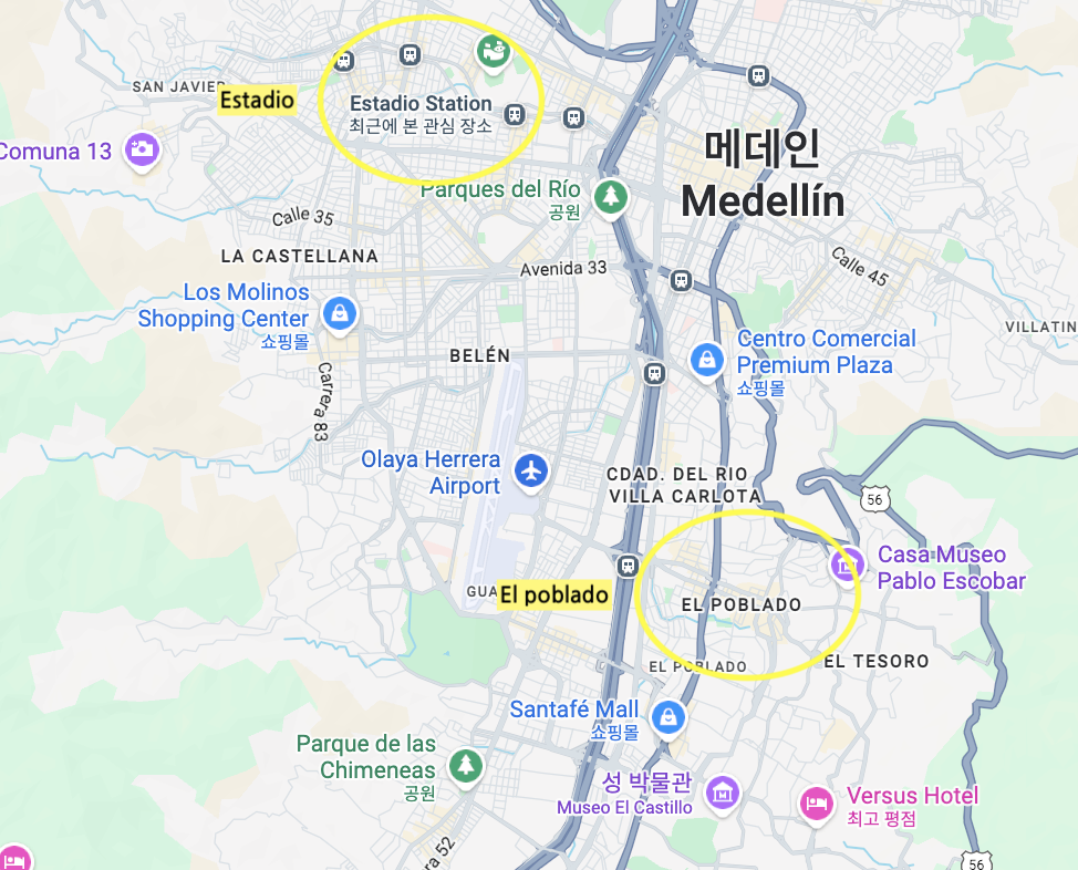 여행자들에게 안전하다고 알려진 지역은 El Poblado와 estadio 지역입니다. 저는 El Poblado에 숙소를 잡았습니다.