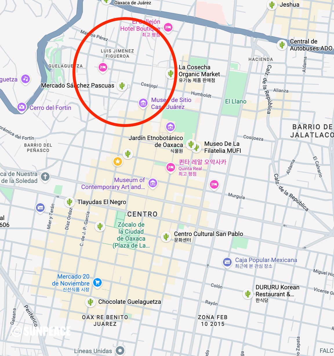와하카에서는 <절대 여기는 해지고 가지마>라고 했던 구역이 있었습니다. (아래의 빨간 지역).